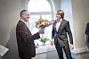 Dekan Jørgen Sejersted utførte eit gamalt ritual ved å gi blomar til senterleiar Christopher Henshilwood.