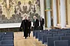 Først kommer dekan Knut Helland. Deretter doktorand Anne Madeleine Botslangen og så komitemedlemmene Ole Trond Berg, Uffe Jakobsen og Jan Froestad. Helland ønsker velkommen før doktoranden tar plass på scenen. Det same gjør førsteopponent Berg.