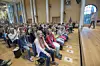 Andreas Wahl, kjend frå mellom anna det populærvitskaplege programmet «Folkeopplysningen», spør sjetteklassingane som er i aulaen for å vere med på Barneuniversitetet.