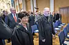 Høgtideleg stemning i aulaen, med universietsleiing og æresdoktorar på fremste rekkje. Æresdoktor Æresdoktorpromosjon