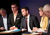 Administrerende direktør i Forskningsrådet, Arvid Hallèn i debatt med rektor ved Universitetet i Bergen, Dag Rune Olsen (t.v.), kunnskapsminister Torbjørn Røe Isaksen og stortingsrepresentant Marianne Aasen (A) om norske høgskoler og universiteter er gode nok i konkurransen med utenlandske læresteder. Foto: Skjalg Bøhmer Vold