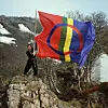 Biletet er teke av Ola Røe: "Young man with Sámi flag in Northern Landscape", 1994. 4 T