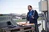 Joachim Reuder kan sende en rute til flyets autopilot via en PC, eller styre det manuelt med radiostyrer. Joachim Reuder viser små, fjernstyrte fly som kan skaffe meteorologiske data. Droner, SUMO fly prosjekt meteorologisk
