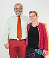 Frode Lillestøl har pynta seg med oransje slips med fiskekrok som nål. I armkroken har han Bente Helland iført bringebærrosa cardigan.