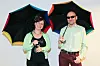 Mary Rørdal og Jostein Mork med matchande mintgrøne overdelar og fargesterke paraplyar.