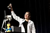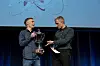 Ove Herdastveit frå Uni Research vann bergensfinalen i fjor. No måtte han levera vandrepokalen vidare. Her saman med programleiar Roe Lauvås jr.