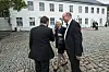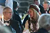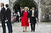 Holbergprisvinnar Onora O'Neill kom til festen saman med sonen Adam Nell. Her blir dei ønskte velkommen av kunnskapsministeren.