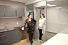 Kristina Kvareng og Amela Defterdarevic ved en møteplass i gangen. UiB har avtaler med flere leverandører, men den årlige møbelmessen i Stockholm er viktig for dem som jobber med innredning og design. – Da får vi blant annet prøvesitte ulike møbler. Det er ikke så mange showroom i Bergen, sier Kvareng (til venstre). Foto: Hilde Kristin Strand