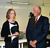Kari E. Fladmark konverserer kong Harald under åpningen av BB-bygget i 2003. Foto: Silje Gripsrud BB-bygget, Œpning *** Local Caption *** Kari E. Fladmark ; Kong Harald