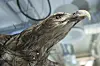 Kraniet, vengjene og føtene er originale. Men sjølve kroppen er av skumplast og vert festa til dei originale fjørene med ståltråd. Dette er ein hubro. Universitetsmuseet Taksidermist Ari Puolakoski Utstilling Naturhistorisk Hubro Fugl