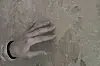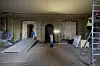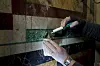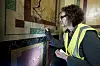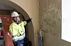 Konservator Janine Wardius reparerer veggen så forsiktig hun kan. Her har det hengt en ovn som har laget merker.