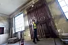 Deler av frisen er lysere enn resten. Der har konservator Jovana Wolff renset. Veggene skal også renses, kvadratmeter for kvadratmeter, for å få bort det gulnede preget. Deretter skal det legges en ferniss på til slutt.