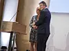 Synnøve Lyssand Sandberg gir den symbolske nøkkelen til statssekretær Bjørn Haugstad. Opning av universitetsaulaen Aula Synnøve Lyssand Sandberg Bjørn Haugstad