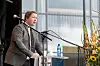 Berit Rokne er den første rektor ved Høgskulen på Vestlandet. - Det er en stor dag for dere, og en stor dag for oss, sa hun fra på scenen på Kronstad.