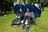 Dei nye studentane Chubina Kumar (t.v.) og Abhira Sivakumar frå Oslo sakna sola under opningsseremonien i Nygårdsparken.