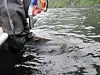 . Bilde viser gjenutsettingen av en av de mange Vossolaksene som er registret i kilenota og som nå er på vei opp i Vossovassdraget