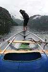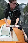 Eirik Straume Normann (26) driv fiske etter laks med kilenot og sitjenot for LFI, Uni Miljø, Uni Research. Snutemerka laks blir avlivd og undersøkt. Del av prosjekt for å redde Vosso-laksen. Svein Kallestad (74) held utkikk.