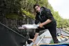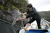 Eirik Straume Normann (26) driv fiske etter laks med kilenot og sitjenot for LFI, Uni Miljø, Uni Research. Snutemerka laks blir avlivd og undersøkt. Del av prosjekt for å redde Vosso-laksen. Eirik dreg opp att steinane som blir brukt til å stengje nota. Svein Kallestad (74) hjelp til.