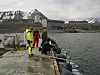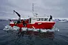 Båten heter Teisten. Vi må langt ut på fjorden for å fylle tankene med til sammen 12 000 liter sjøvann. Det er en strevsom jobb som tar det meste av dagen. Foto: Jorun Egge