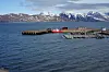 Her ligger mesokosmos ved flytebrygga. Kings Bay Marine Laboratory i bakgrunnen. Foto: Gunnar Bratbak