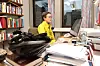 Hjelmen til Ingunn Lunde finner plass på kontorpulten mellom bøker og PC. Foto: Eivind A. Pettersen