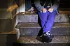 En rusmisbruker sitter på trappa til Knut Fægris hus. Han har gjort klar sprøyta si når Fredrik og Mathias kommer forbi. -- Flere av de narkomane som holder til i parken og på Høyden har vi en god tone med. Det er alltid greit å ha en god dialog. Det hender også vi får tips om saker og ting fra de vi kjenner i miljøet, sier Fredrik.