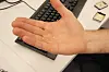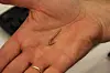 Ikkje så lett å sjå, men i handa har Knut Andreas Bergsvik ein fleire tusen år gamal drill, laga av bergkrystall. Foto: Hilde Kristin Strand