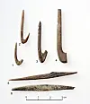 Dette er ulike fiskekrokar som vart funne i Sævarhellaren. Foto: Universitetsmuseet