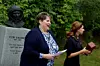 Jurij Gagarin er kommet tilbake til Bergen etter mer enn 50 år – denne gangen i bronse. Avdukingen av bysten samlet mye presseoppbud, publikum, og den russiske ambassaden. Men det var denne damen som satte det hele i gang.