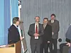 Tre av Norges første Senter for fremragende forskning (SFF) havnet i Bergen. De ble ledet av Sverre Bagge (CMS), Arne Skauge (CIPR) og Eystein Jansen (Bjerknessenteret). Her gratulerer Christian Hambro, daværende administrerende direktør i Forskningsrådet dem med tildelingen. Bildet er fra 2002/2003. Arkivfoto: Magnus Vabø/UiB.