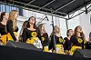 Høgtideleg var det likevel, der ein raud laupar var lagt frå Museplass 1 og opp til scenen, lasta med lokale og nasjonale prominensar med utsikt til dei ferske studentane.