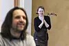 NRK Betas Eirik Solheim brukte såkalte VR-briller - virtuell virkelighet, for å styre en liten drone rundt i aulaen. Han klarte blant annet å fly under Steinway-flygelet til 1,6 millioner kroner uten å gjøre noen skade. Foto: Dag Hellesund