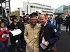 Men UiB-rektor stoppet blant demonstrantene, og fikk også låne en hatt av leder for Norsk studentorganisasjon, Anders Kvernmo Langset.