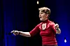 Jane Skjoldli, stipendiat ved institutt for arkeologi, historie kultu- og religionsvitenskap på UiB i aksjon på scena.