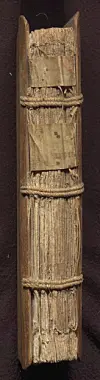Legg merke til permene av eiketre, og de to middelalderske pergamentbitene i bokryggen (ses best på siste side i Marcus-visningen). Boken har hatt et tittelblad som en gang er blitt borte, ikke usannsynlig på grunn av flittig bruk.