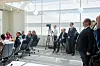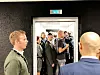 Etter at instituttleiar Larsen med fleire er ferdige, blir pressa pressa inn i heisen og så møtest alle igjen i studio.