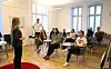 Som publikum sit fem andre elevar og to instruktørar og lyttar til det ho seier, og ser på kva kroppsspråket fortel. Eit videokamera surrar og går i bakgrunnen. Dei får med seg kvar minste detalj.