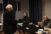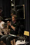 Sonya Dudaeva og Rebecka Ahvenniemi studerer kvart sitt store partitur med konsentrert mine. Dragefjellets Musikkorps (Dragen) har nettopp spelt «Gioco di Aria», komponert av Ahvenniemi. Dirigent: Sofya Dudaeva. Dei to kvinnene er ein del av Griegakademiet sitt prosjekt «Miniatyrer med Dragen». Fem komponiststudentar har skrive kvart sitt verk – fem studentar som tek vidareutdanning i ensembleleiing korps dirigerer. – Me har ikkje lov å gjera fleire endringar no, men eg kunne eigentleg tenkt meg det, seier Ahvenniemi. Tysdag kveld var nemleg siste øving med korpset. Laurdag kan alle som er interesserte høyra den nye musikken i Korskirken. – Som å adoptera vekk barn – Eg gler meg til klangen i Korskirken – den vert heilt annleis enn i øvingslokalet. Men eg er nervøs. Eg plar verta det når eg skal spela sjølv, men eg trudde eg skulle sleppa det no, smiler Anders Torgunrud Røshol. – Musikken vert så personleg. Eg må halda meg litt fast i stolen når eg høyrer min eigen musikk. Nokon har samanlikna det å gi frå seg musikk med å adoptera vekk eit barn, humrar Webjørn Sæther. Det er ikkje noko nytt at studentane ved Griegakademiet har prosjekt. Men eit prosjekt som dette, med eitt tett trekantsamarbeid mellom to studentgrupper og eit amatørkorps, har ikkje vore gjennomført før. – Me har hatt mykje kontakt med Dragen opp gjennom åra, og har snakka om eit slikt prosjekt. Det vart konkret i fjor haust. Eg og Harald Eikaas, som då både var ansvarleg for kurset i ensembleleiing ved Griegakademiet og musikalsk ansvarleg hos Dragen, snakka saman ein dag me sat i kantina. No har det vore fire temmeleg intense veker, seier Morten Eide Pedersen og smiler. Han er universitetslektor og underviser i samtidsmusikk og komposisjon. – Treng ikkje høyrast ut som korps – Ein kan driva på lenge med kvart stykke, seier Sæther. – Og ja, det har nok hendt at eg har tenkt at «nja, det der funka visst ikkje heilt». Så går ein heim og endrar. Eit janitsjarkorps har mange ulike instrumentgrupper. – Eg synest det er spanande at det er så heterogent. Det er mange klangar i eit korps – og det treng ikkje høyrast ut som korps, seier Ahvenniemi. Ho seier at ho ser på kvart prosjekt som ein fase. – Dersom ein ikkje gjer det, får ein aldri gjort noko, seier ho. – Dersom ein berre skriv ting ein veit fungerer, utviklar ein seg ikkje. Det er kjipare å ta store sjansar dersom ein skulle få ei stor bestilling, seier Torgunrud Røshol. Børø ser for seg at han vil halda fram med å skriva musikk for korps. – Det er mest praktisk når ein bur i Bergen, seier han. Vidareutdanning Sonya Dudaeva skal dirigera Rebecka Ahvienniemi sitt verk. – Eg kjenner henne så godt etterkvart, og me kan utfordra kvarandre og stilla spørsmål. Samstundes vil eg jo ikkje skada det kunstneriske, seier Dudaeva og smiler. Ho er ferdig med både mastergrad og pedagogikk, og tek no vidareutdanning i ensembleleiing. – Eg tek alt eg kan ta ved Griegakademiet, smiler 27-åringen, som òg spelar fløyte i Dragen når ho ikkje dirigerer dei. Fredrik Schjelderup dirigerer Dragefjellets Musikkorps. Komponist Anders Torgunrud Røshol følgjer interessert med bak dirigenten. Schjelderup har òg komponert eit verk – men det får han ikkje dirigera sjølv. Alle foto: Hilde Kristin Strand Tre satsar – Det er eit høgt nivå på musikaarne, så me har ikkje måtta ta så mykje omsyn som me måtte gjort dersom me skulle skrive for eit korps i til dømes andre eller tredjedivisjon. Samstundes er jo cluet å skriva det vanskelege på ein enkel måte, seier Sæther. Fredrick Schjelderup tek plass på dirigentpodiet. Dei fem dirigentane har fått ein halvtime kvar. Anders Torgunrud Røshol sit på ein stol bak Schjelderup, med partituret på fanget. Han har komponert tre satsar. Den første er rask. – Denne spelte de bedre sist, seier Schjeldrup og slår av. – Me byrjar i takt 10. Eide Pedersen og Halldis Rønning, som underviser i ensembleleiing, følgjer med frå sidelinja. – Ein har mange konkrete prosjekt på Griegakademiet, og ein må levera. Det er nemleg nokon som ventar – og då må ein må levera godt nok. Men godt nok, kva er det, spør Eide Pedersen. – Det er skrekkblanda fryd knytta til dette. Det vert ei nådelaus bevisstgjering. Og det vert på mange måtar som ein spurt – og når ein er ferdig med den, skal ein i gang med neste prosjekt. Men det er ein bra læringsprosess. Halldis Rønning evaluerer saman med komponist Rebecka Ahvenniemi og dirigent Sofya Dudaeva.