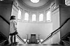 Me ser opp mot tårnsalen. Den har ikkje vore open for publikum på lenge, lenge. Trappa svingar seg heilt frå vestibylen og opp hit.